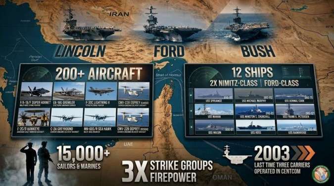 Sebagai perbandingan historis, pengerahan tiga kapal induk dalam satu komando kawasan Timur Tengah yang dikoordinasikan US Centcom, terakhir kali tercatat pada 2003, saat Amerika Serikat menginvasi Irak untuk menggulingkan Saddam Hussein.